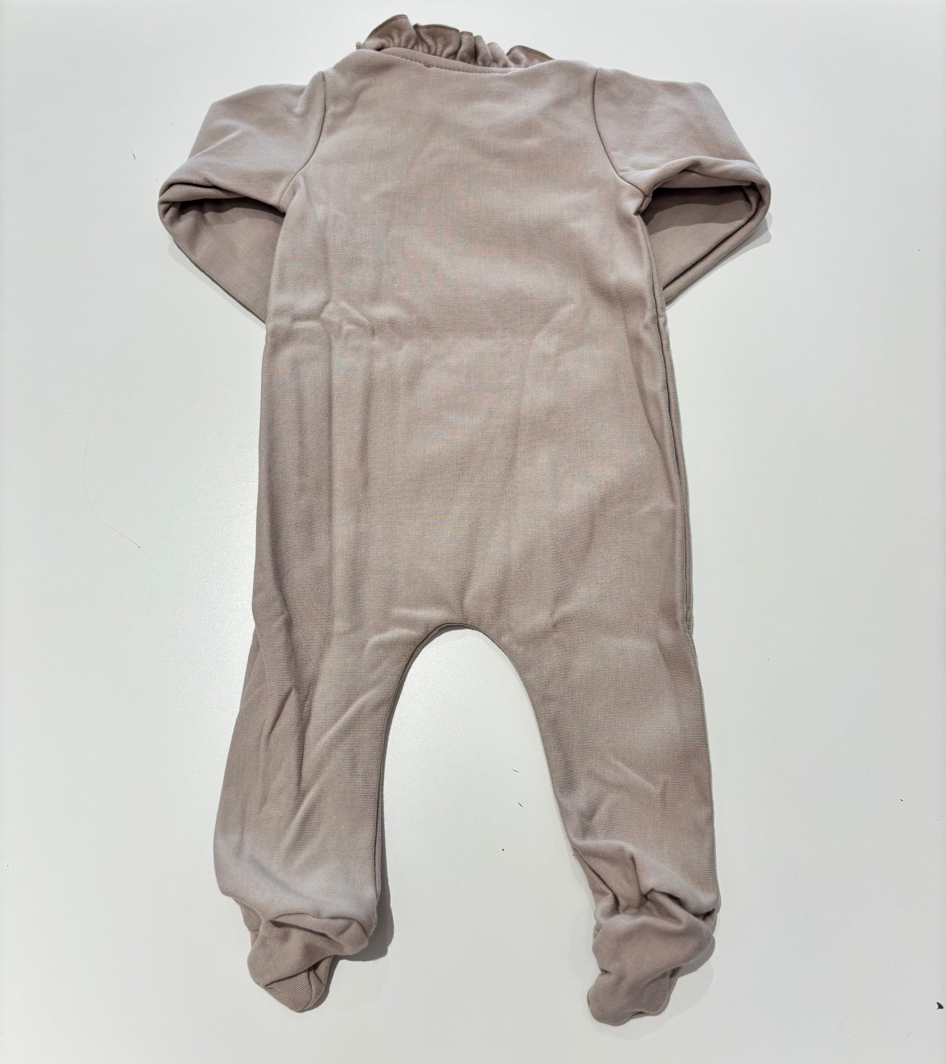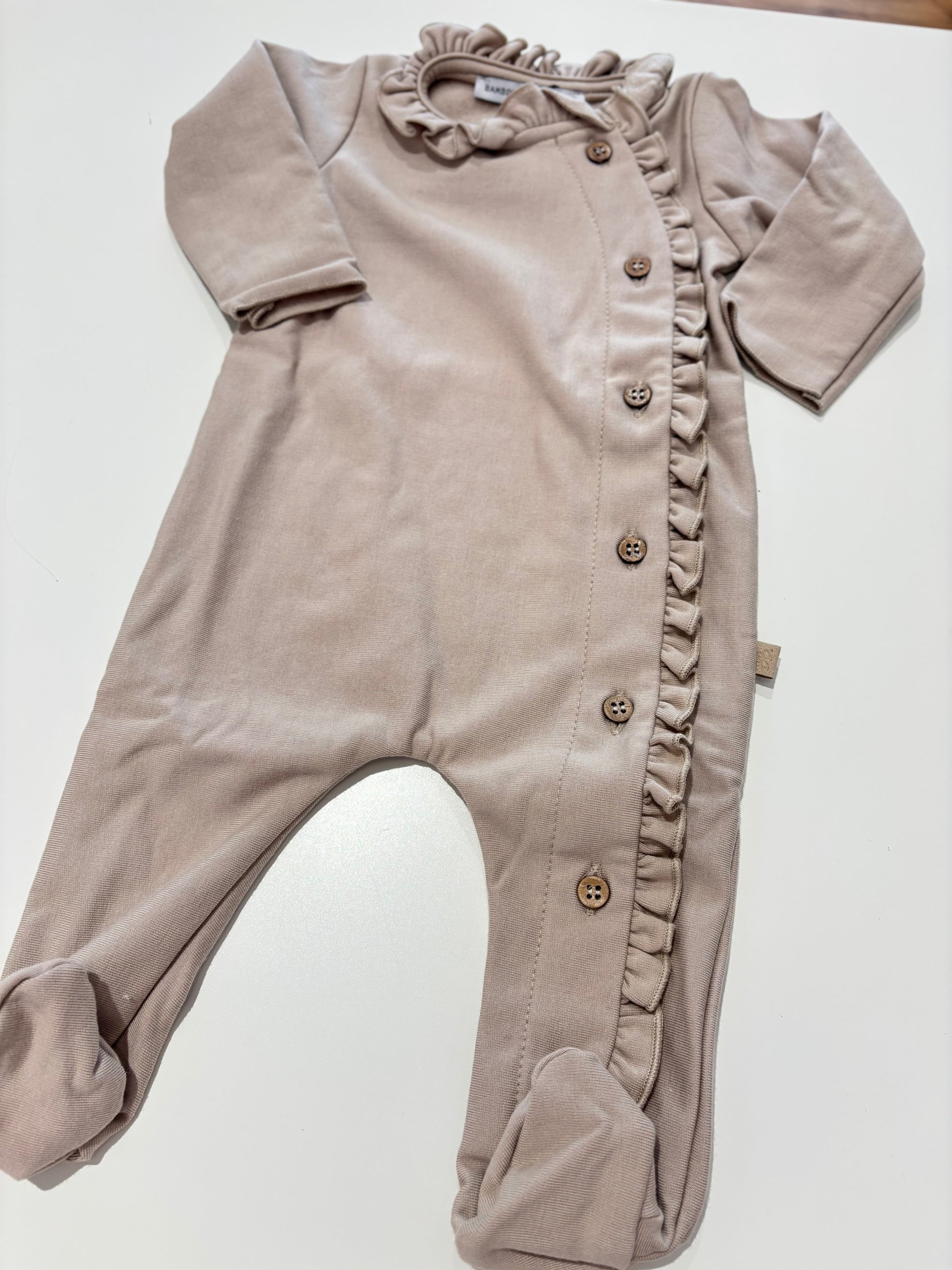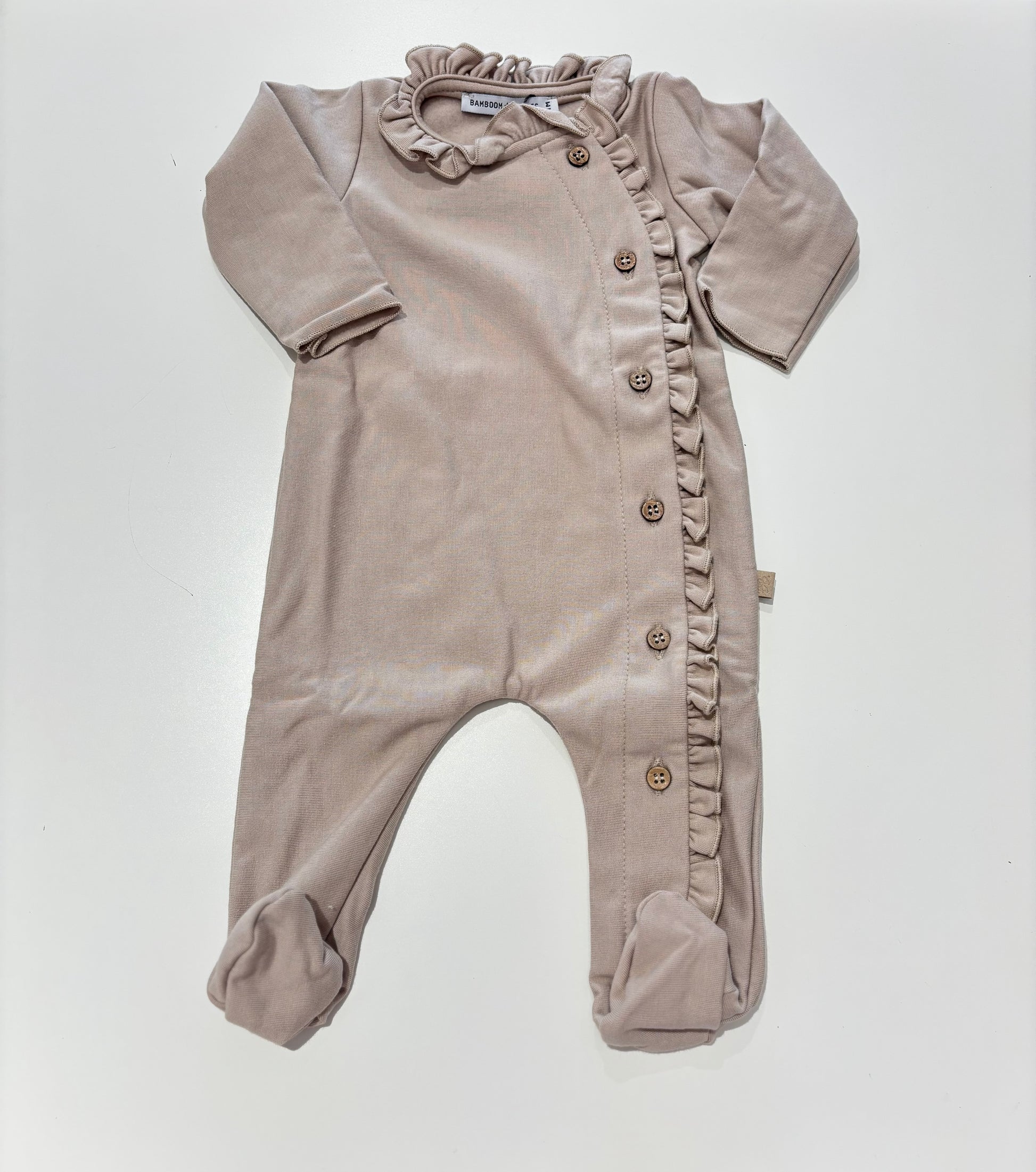 Tutina intera con colletto e piedini.Volant lungo tutta l'apertura frontale con bottoni in legno. BAMBOOM Rif.677