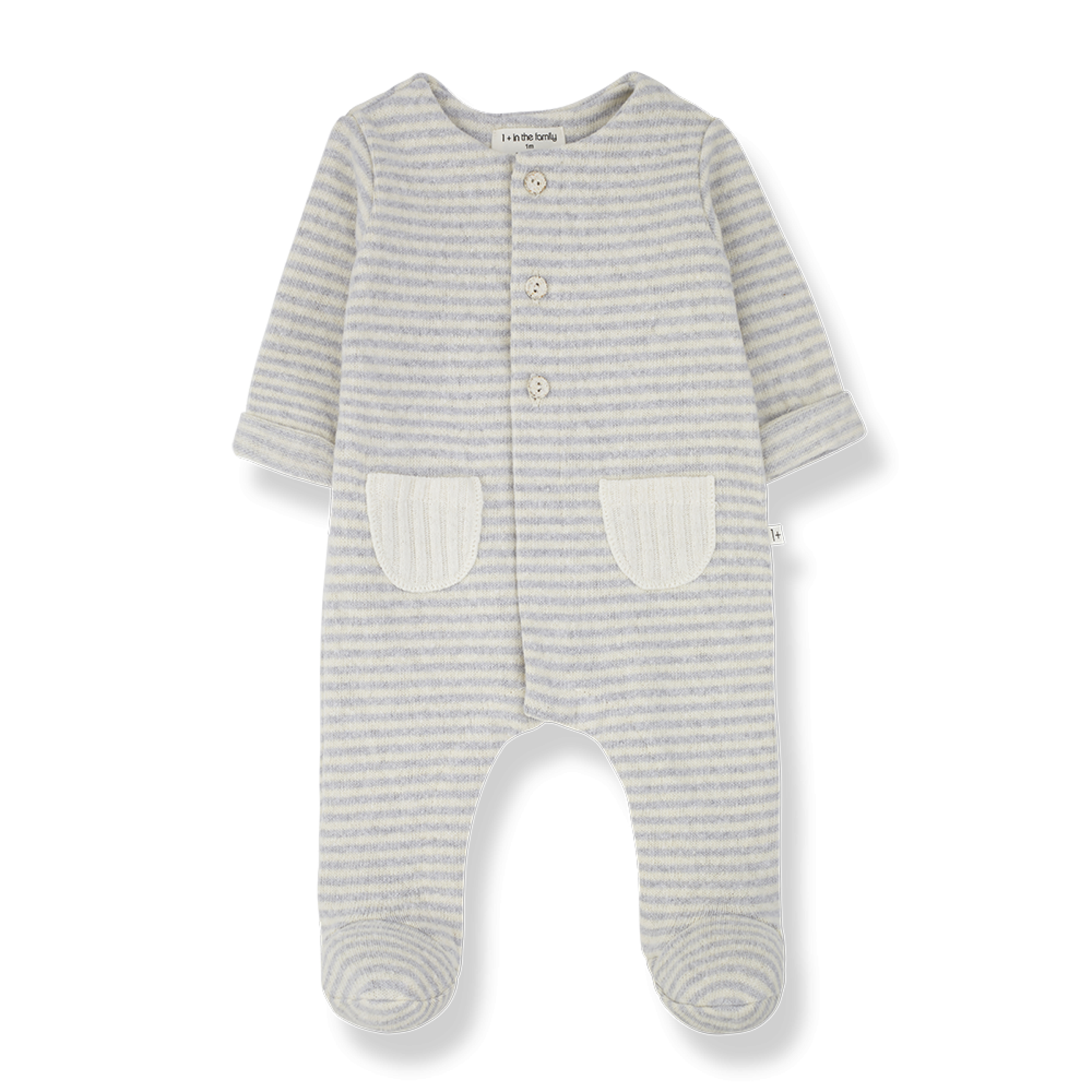 Tutina intera con piedi in cotone caldo, con taschine frontali, bottonI in legno e automatici sul davanti e sul fondo per un apertura totale. 1+IN THE FAMILY Rif. ADRIA